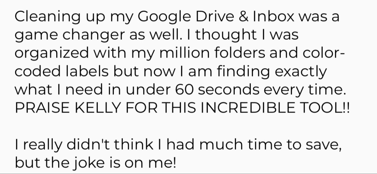 I went from 16,000+ emails and a messy desktop and Google Drive to inbox zero and feeling completely organized and confident that I know exactly how to spend my time each day. This structure has given my high-achieving, fast-moving ADHD brain real freedom and peace of mind.
