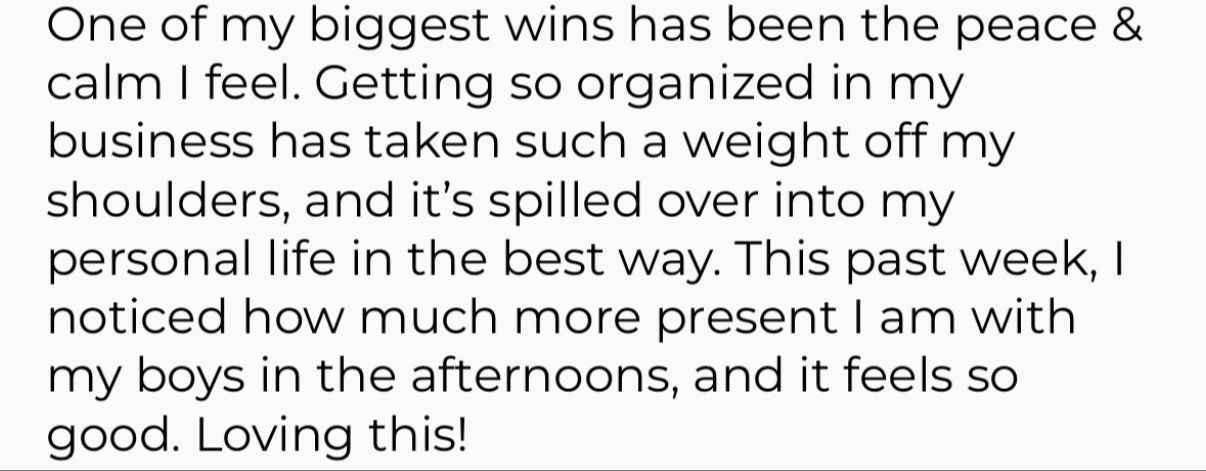 One of my biggest wins has been the peace and calm I feel. Getting so organized in my business has taken a weight off my shoulders, and it’s spilled over into my personal life in the best way. I’ve noticed I’m more present with my boys in the afternoons, and it feels really good.